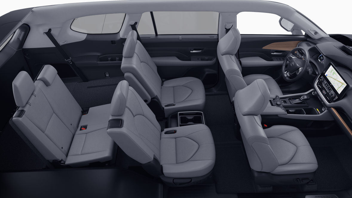- 7-passenger seating with second-row fold-down captain's chairs and fold-down inboard armrests, adjustable headrests and two cup holders mounted on the floor; and 60/40 split, fold-down third-row seats with sliding headrests and recline function
